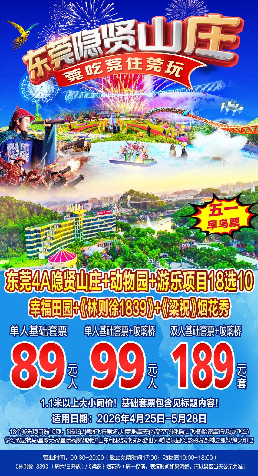 3、动物园开放时间为:10:00-18:00,快活大舞台和《梁祝》烟花秀表演每逢周一停演(节假日除外),在法定节假日期间,门票不包含烟花秀座位票,具体费用以现场公示为准;景区营业时间、园区设施及剧场表演等开放时间如有调整,请以当日景区现场公示和通知为准