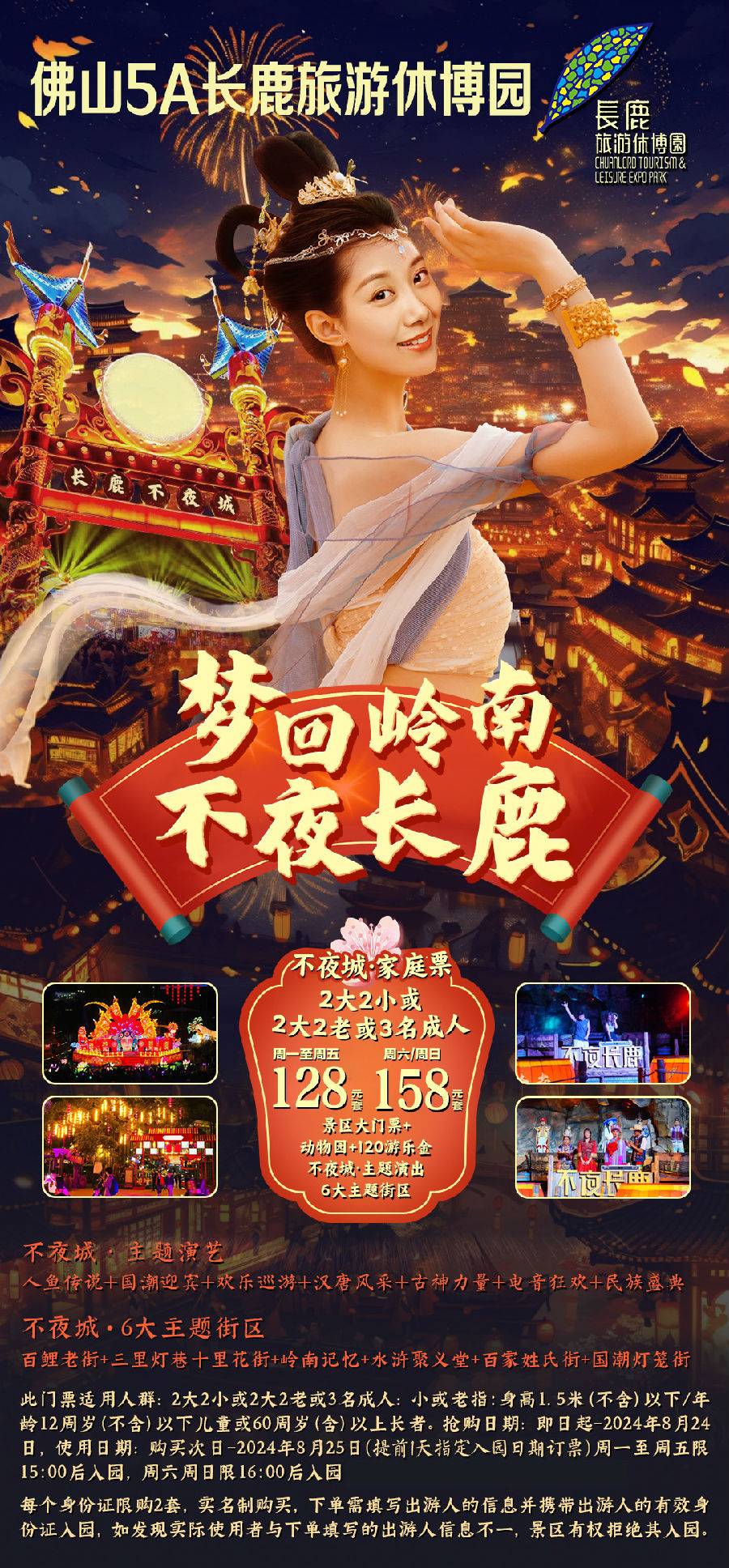 1、长鹿狂欢不夜城家庭套票(2大2小/老或3大)含入园票+动物园+120游乐金+不夜城主题演艺+6大主题街区
