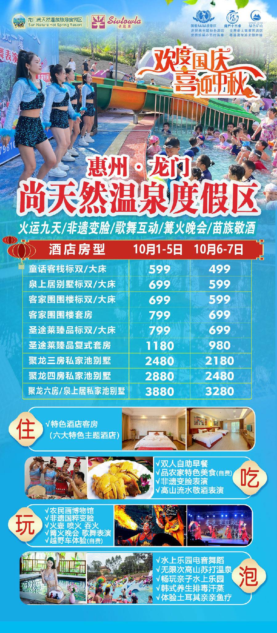 【国庆专场】599元起!惠州龙门4A尚天然温泉客家围酒店标准房/泉上居别墅标准房+2大2小早餐+水上乐园+温泉&汗蒸&鱼疗+农民画博物馆+篝火晚会【有效期2025年10月1-7日】