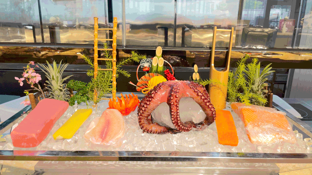 各类海鲜、寿司、刺身、冰盘、串串