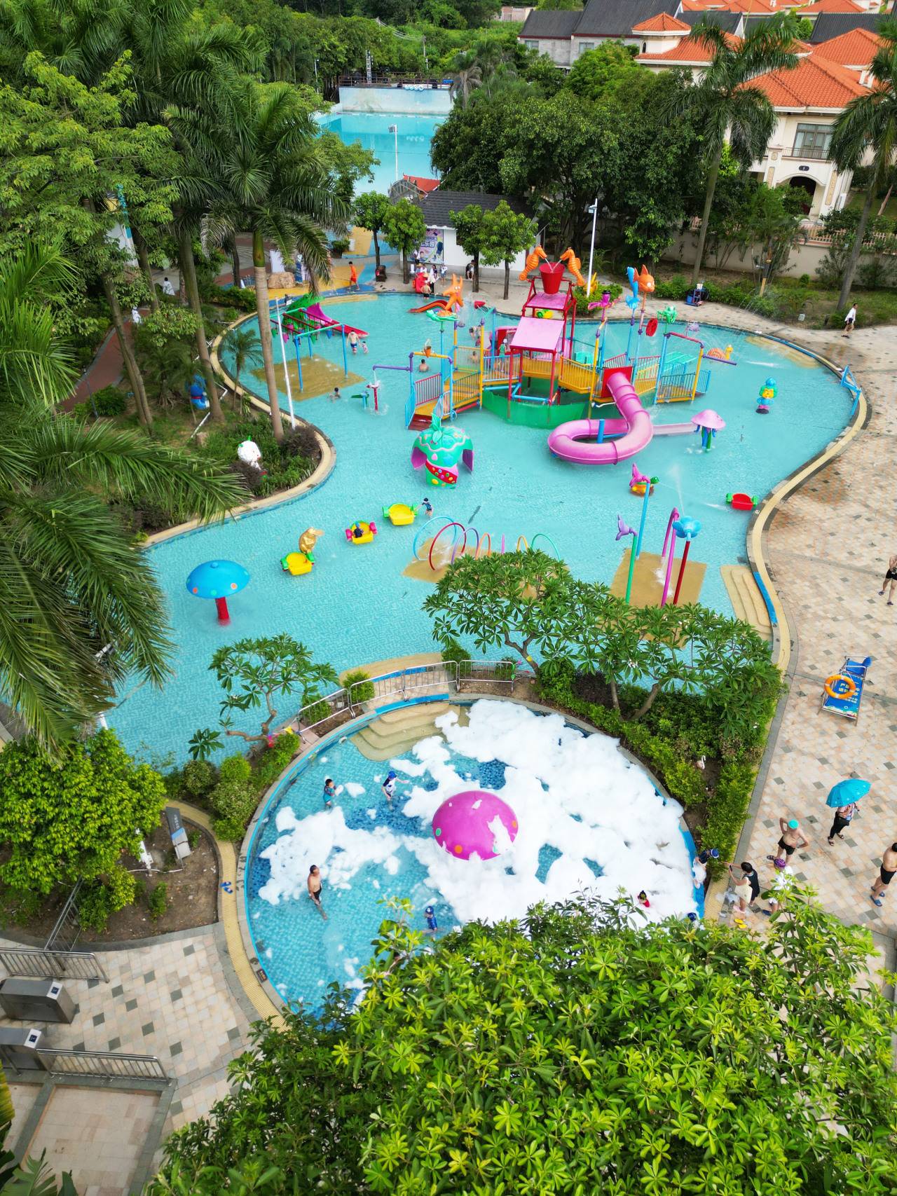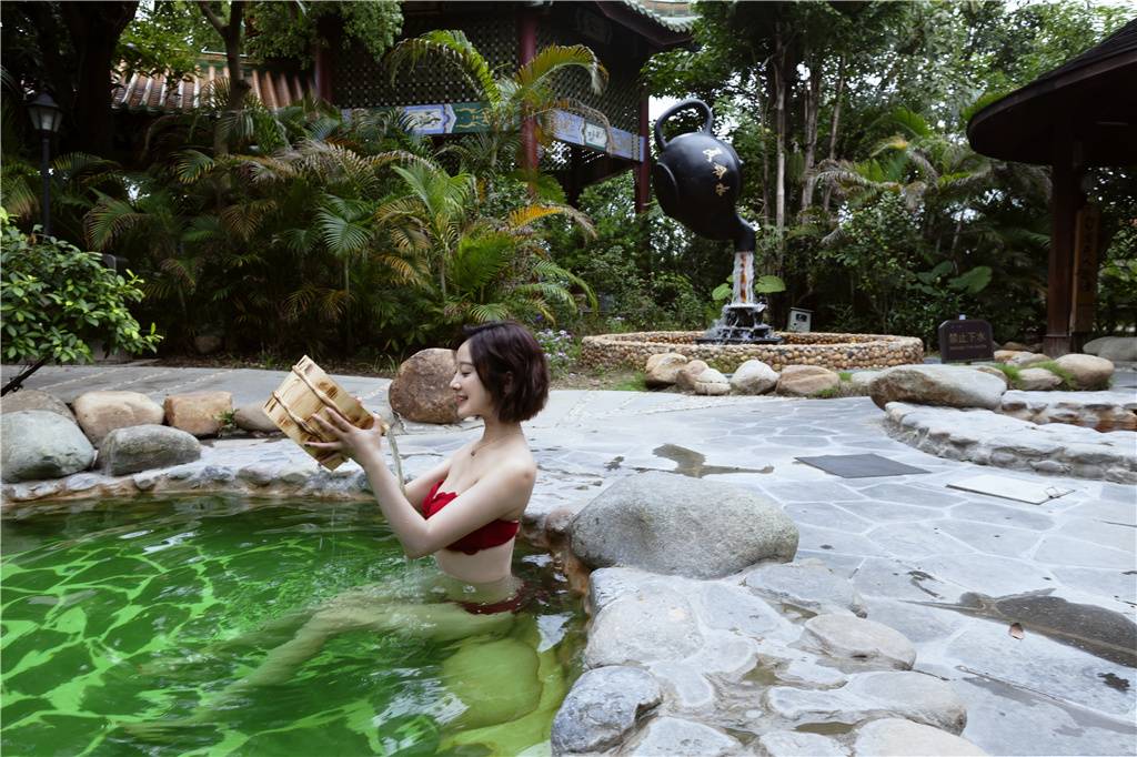度假村温泉区域占地面积6万平方米,60个需天温泉池,划分为经典风情区、中式风情区、泰式风情区、日式风情区,欧式风情区、夏日风情区六大区域氡温泉,并有动感十足的1600立方温泉冲浪池和温泉水疗按摩设施等。