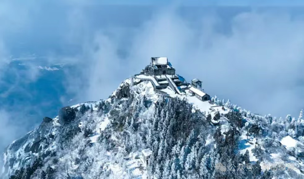 山路、寺庙都盖上了雪被,阳光下一片白,树木枝条被冰晶包裹着,闪烁如琉璃世界。若遇上还未散尽的白雾,缭绕间玉树琼花若隐若现,更像闯入了仙境般。