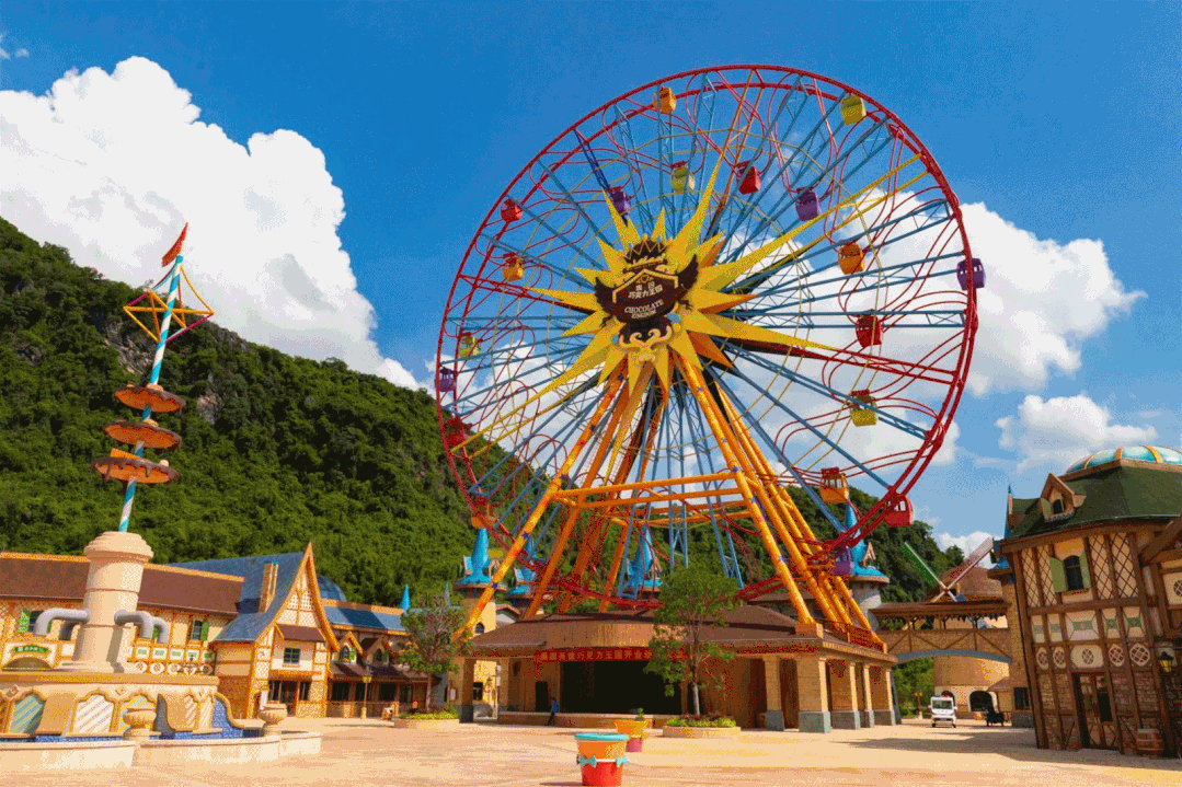 粉色少女系的糖云国、甜美梦幻的奶溪国激情刺激的可可洞国,横跨天际的七彩摩天轮