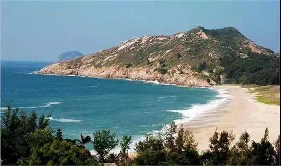 洁白的沙滩,黛绿的林带,碧蓝的大海