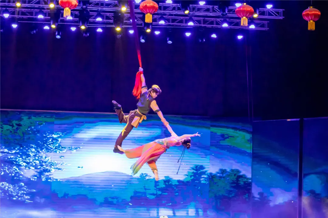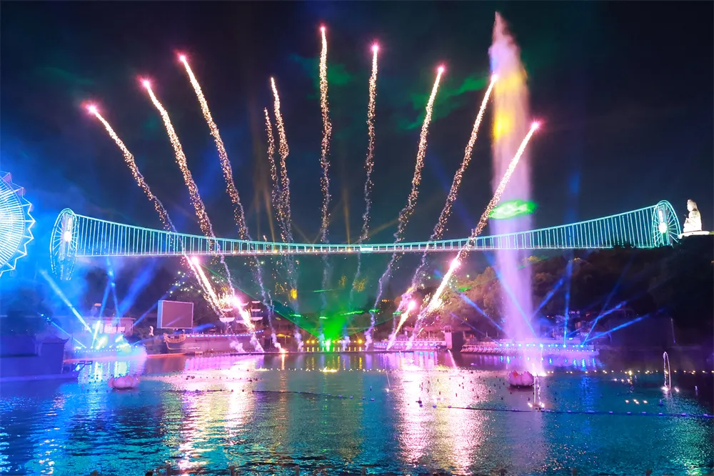 《梁祝》水舞灯光秀是隐贤山庄景区的独特表演,将水、舞、灯光完美结合。精湛的舞蹈、流畅的水幕,绚丽的灯光和璀璨的烟花,共同打造出一场如梦如幻的视听盛宴。