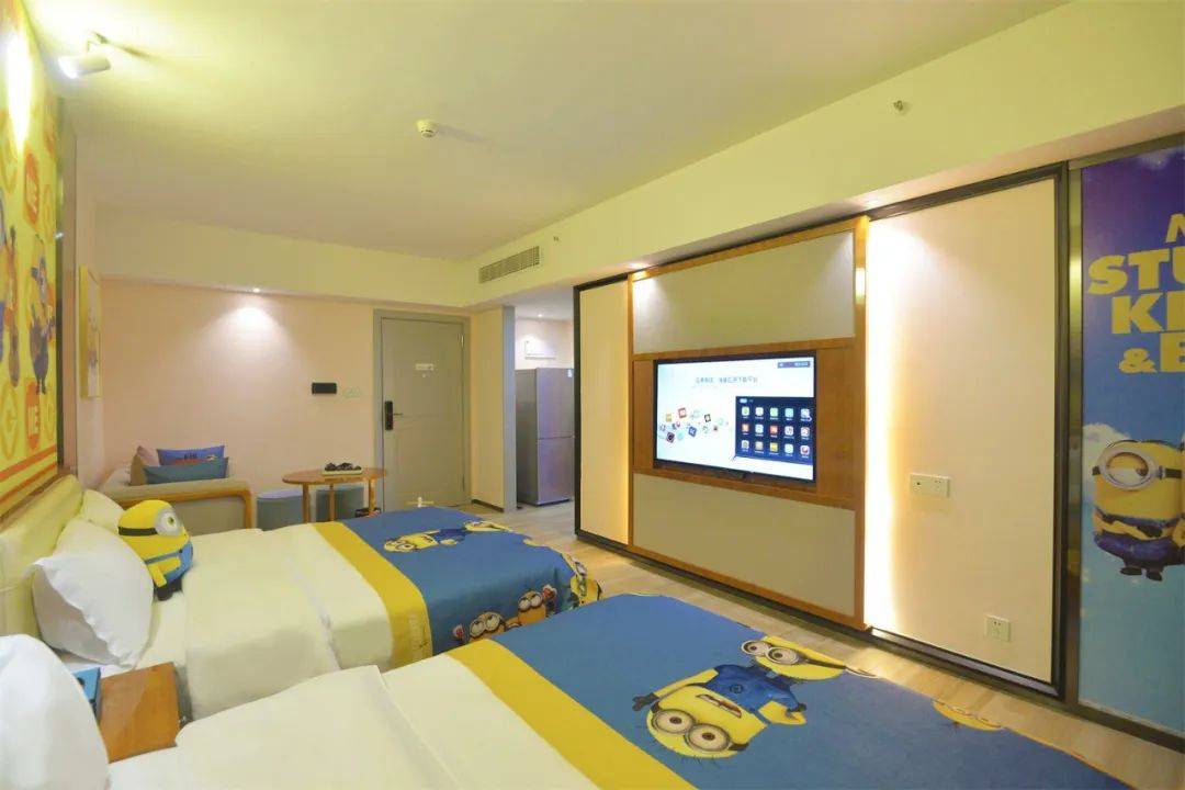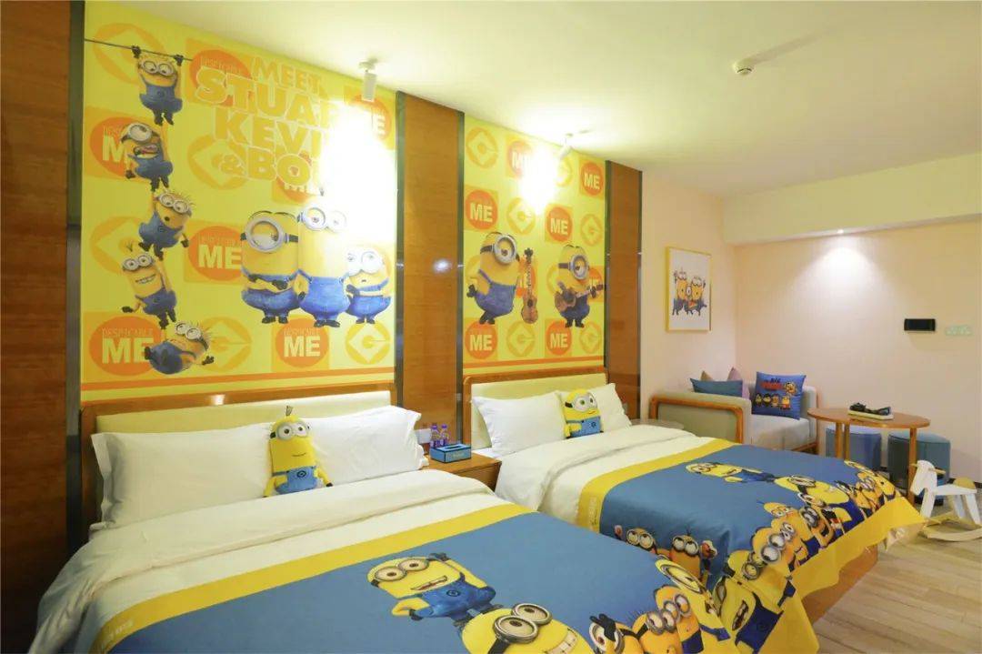 整个房间的装饰令人仿佛置身于小黄人的世界,萌爆人心的小黄人不只是出现在床上,还出现在你的梦里~