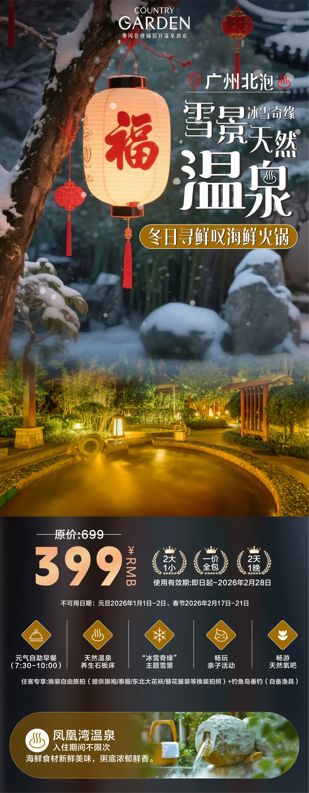 【泡天然温泉】 泡凤凰湾天然温泉赏“冰雪奇缘”雪景+&养生石板床(14:00-22:00)