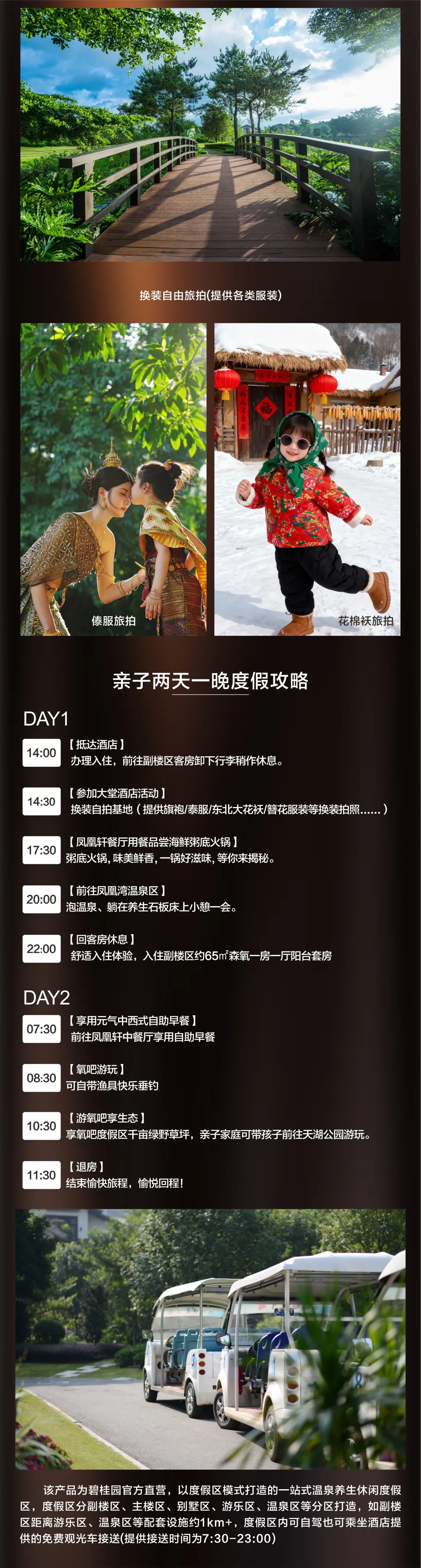 别墅区距离游乐区、温泉区等配套设施约 1km+ ,度假区内提供免费观光车接送服务(提供接送时间为 7:30-23:00 )
