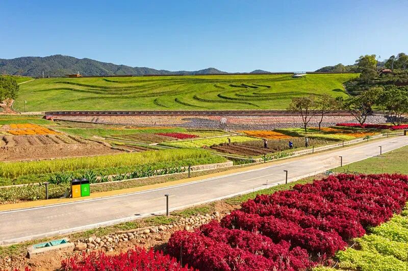 一路在园内漫步,600 种花卉齐齐展身姿——罕见的中叶紫薇,沿路开放的硫华菊,山谷中正盛花的美丽异木棉和簕杜鹃,还有大肚木棉、鸡冠花、百日菊、无尽夏……一年四季,季季有花海,时时有花赏。