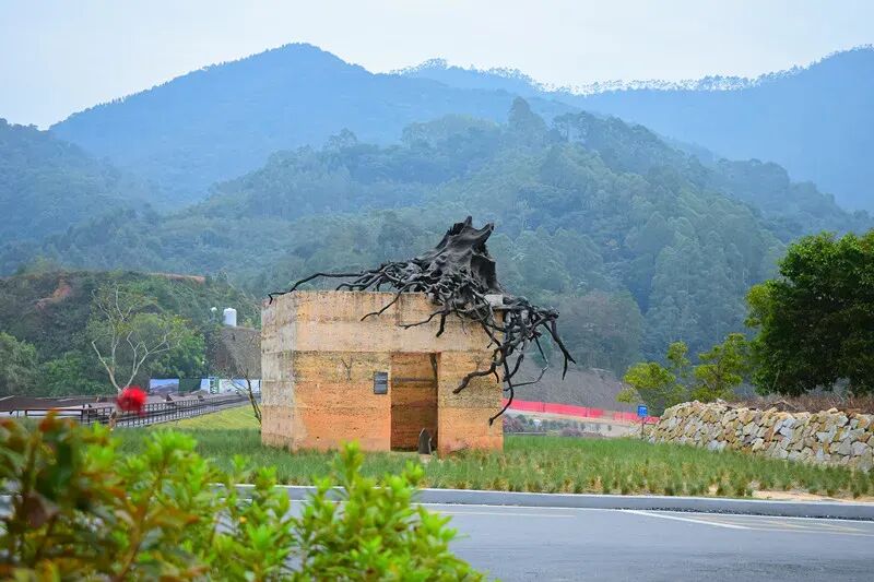 风化的荔枝木树桩搭配就地取土制成的夯土墙