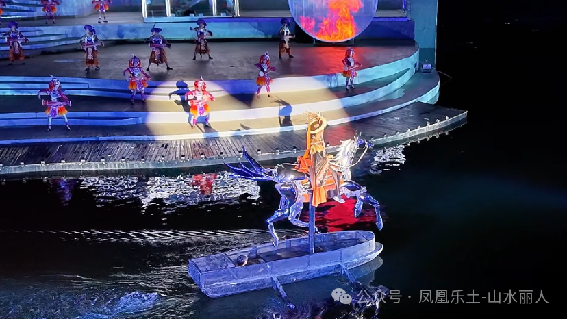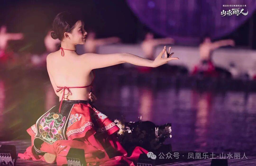 演出深挖清远“凤城传说”,从 “凤凰救民” 的古老故事,讲到壮苗瑶三族的生活史诗:瑶族少女 4 米长发入水化作星河,苗族银饰碰撞出 “会唱歌的月光”,20 米红绸突然从天而降,把你卷入热闹的民族婚俗现场,每一秒都是 “眼睛不够用” 的震撼。