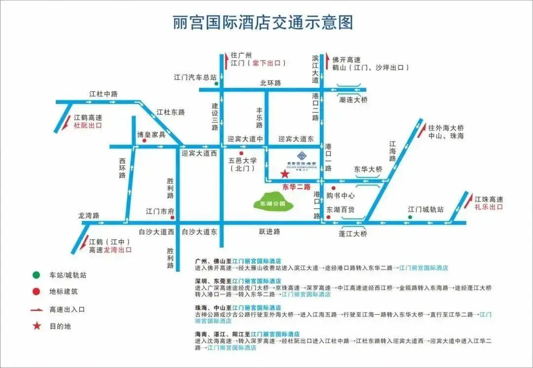 江门丽宫国际酒店位于广东省著名的五邑侨乡首府——江门市,地处市区最核心及繁华的地段,东临五邑地区的学府五邑大学,北倚蜿蜒的天沙河,南面正对江门的“城市之肺”东湖公园;西靠购书中心、影城、电脑城和悠闲购物食街。距港澳码头约20分钟车程,距江门总车站仅5分钟车程,交通十分便利。