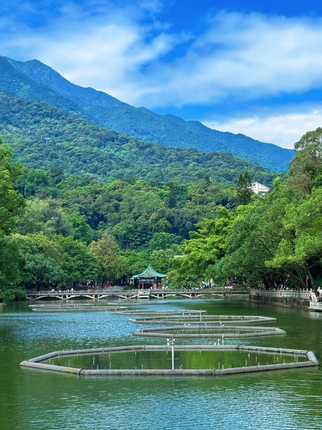近处的湖面、远处显眼的罗浮山脉