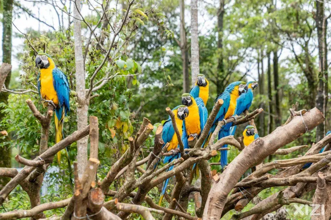 绯红金刚鹦鹉和蓝黄金刚鹦鹉们排着队