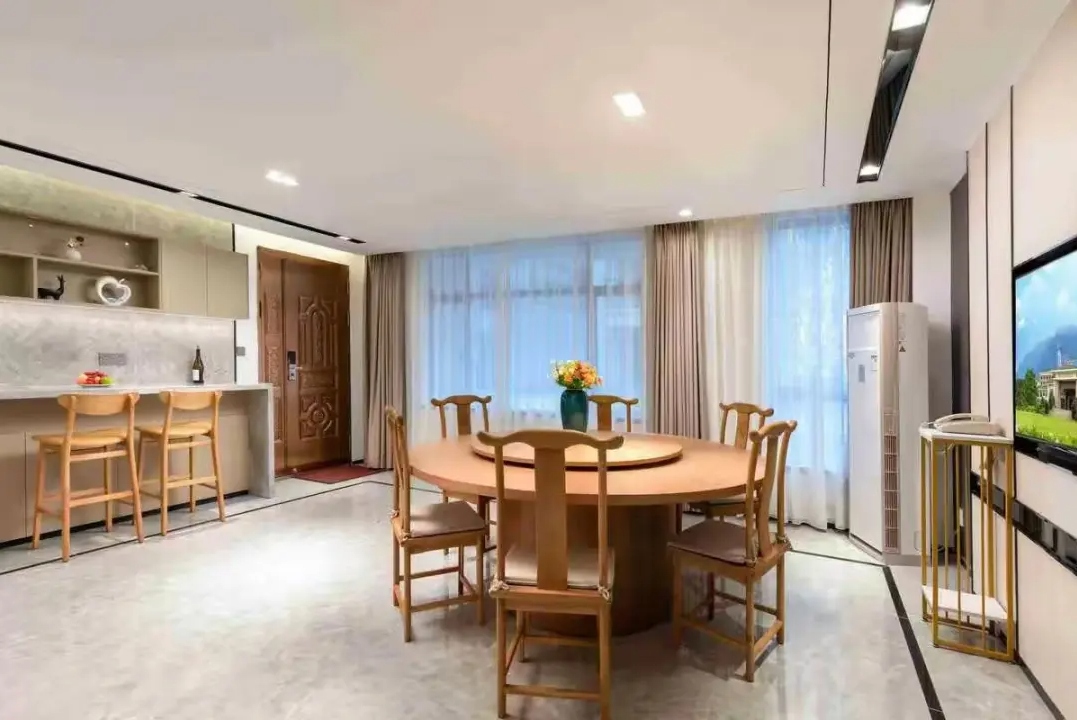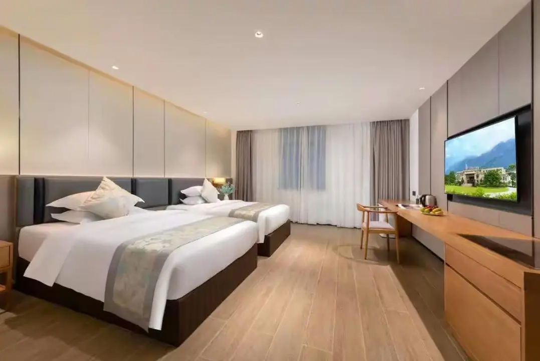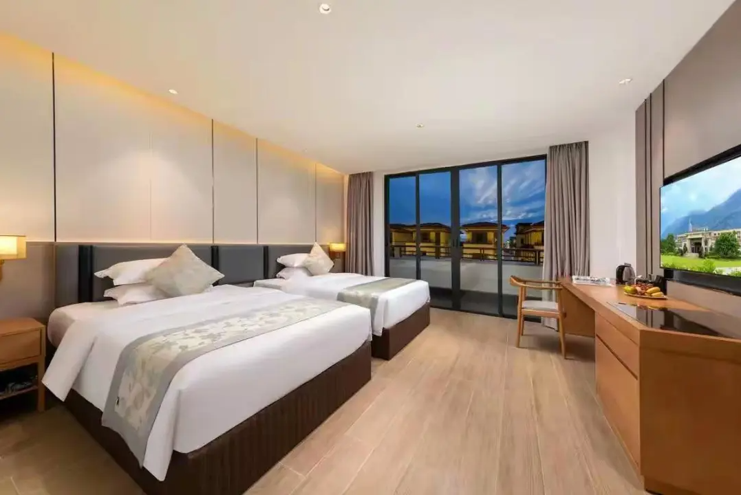 酒店房型介绍:房型为5房别墅拆分户型,每个房间都带有独立卫浴,互不打扰,双人房(1.35*2米),大床房(2*2米),房间配有一次性洗漱用品,房间不带有温泉泡池,同事预定5间可升级一栋5房别墅,带有私家温泉泡池和麻将畅玩