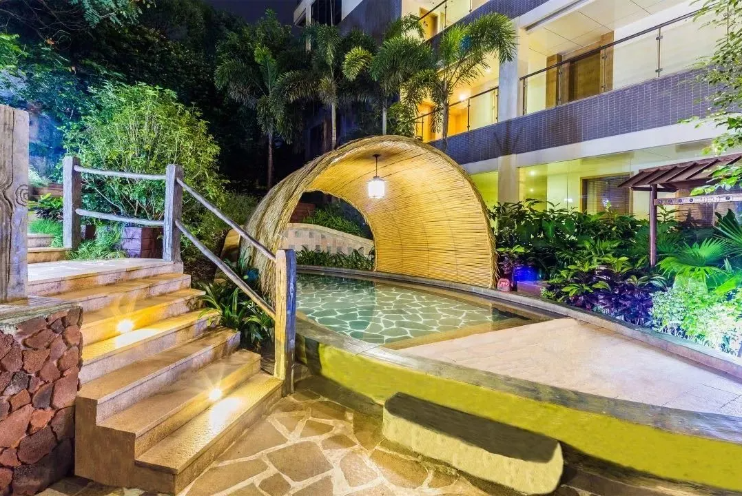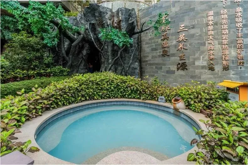 酒店温泉、泳池区介绍:酒店拥有70多个露天温泉池,分为十大区,包括动感娱乐区、日月乾坤区、五常六德区等。温泉水富含硅酸、氟、偏硅酸、氡等多种有益微量元素,属弱碱性温泉水,是2017年广东省首批真温泉。以下是一些特色泡池介绍 :溶洞温泉区:采用钟乳石和石笋打造出形态各异的景观,冬暖夏凉,洞内有鱼疗池、多种不同功效的中药池等。动感水疗区:特设动感理疗池、儿童池、冲浪池、休闲泳池及标准泳池等。海浪池有升级版七彩泡泡浴,休闲泳池有网红摇摆桥。树洞温泉区:位于溶洞温泉区旁边,一树一世界,一洞一天堂,另设温泉雾疗,对呼吸系统疾病有较好疗效,开放时间早上9点--晚上11点,可无限次进出