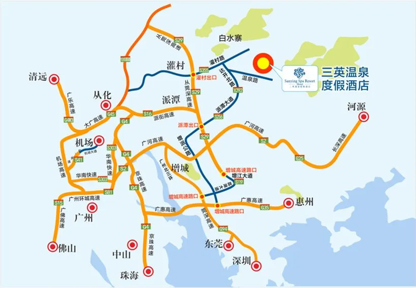 广州、佛山出发: 华南快速(S303)→广河高速(S2)→从莞深高速(S29)(往从化方向)→灌村出口下→达开北路(X292)→三英温泉度假酒店 (1.5小时直达)