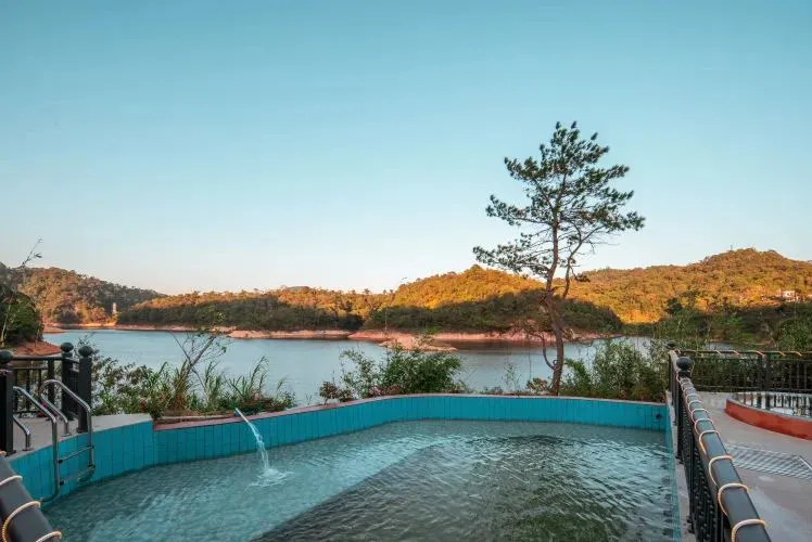 2、入住房间为园景或湖畔泡池房,房间带有私家温泉泡池,赠送2池水,大床房1.8米,双床房1.3米X2张,配有一次性洗漱用品