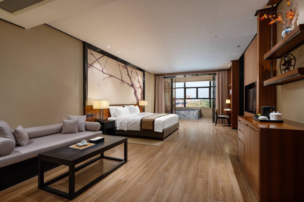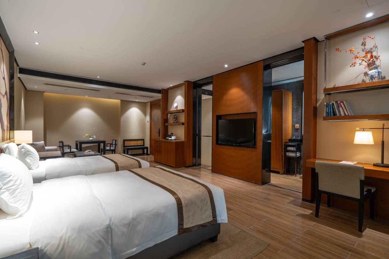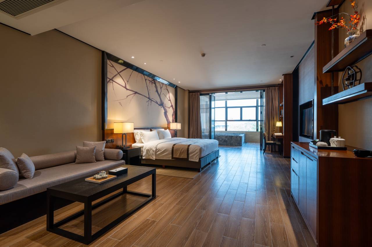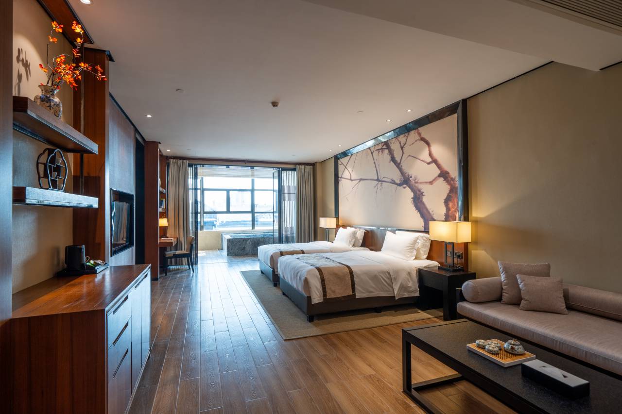 31间108平新中式奢居,房间真的非常大!双床1.4米,大床2米,间间配有超大的私汤温泉泡池,柔软舒适床品、干湿分离卫浴间、饮茶区域+阅读区域+餐食区域+迷你吧通通配齐,以雅致空间与私密汤泉,打造高端静谧度假体验。