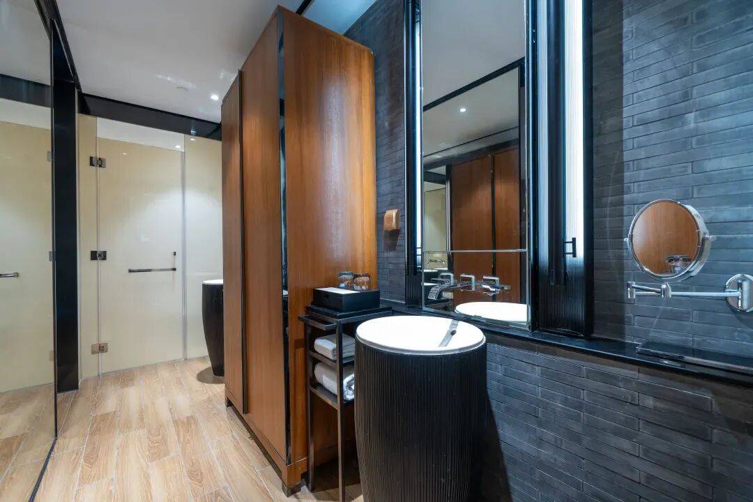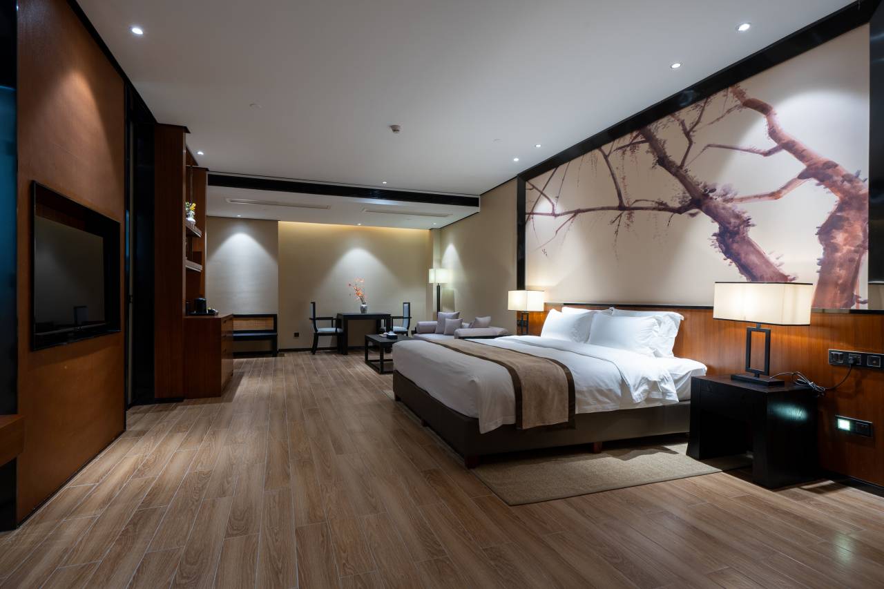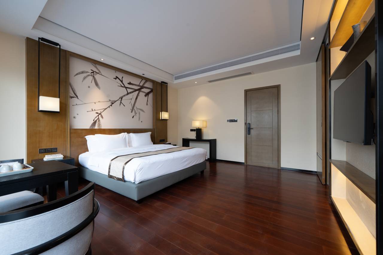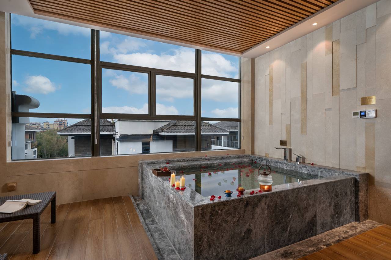31间108平新中式奢居,房间真的非常大!双床1.4米,大床2米,间间配有超大的私汤温泉泡池,柔软舒适床品、干湿分离卫浴间、饮茶区域+阅读区域+餐食区域+迷你吧通通配齐,以雅致空间与私密汤泉,打造高端静谧度假体验。