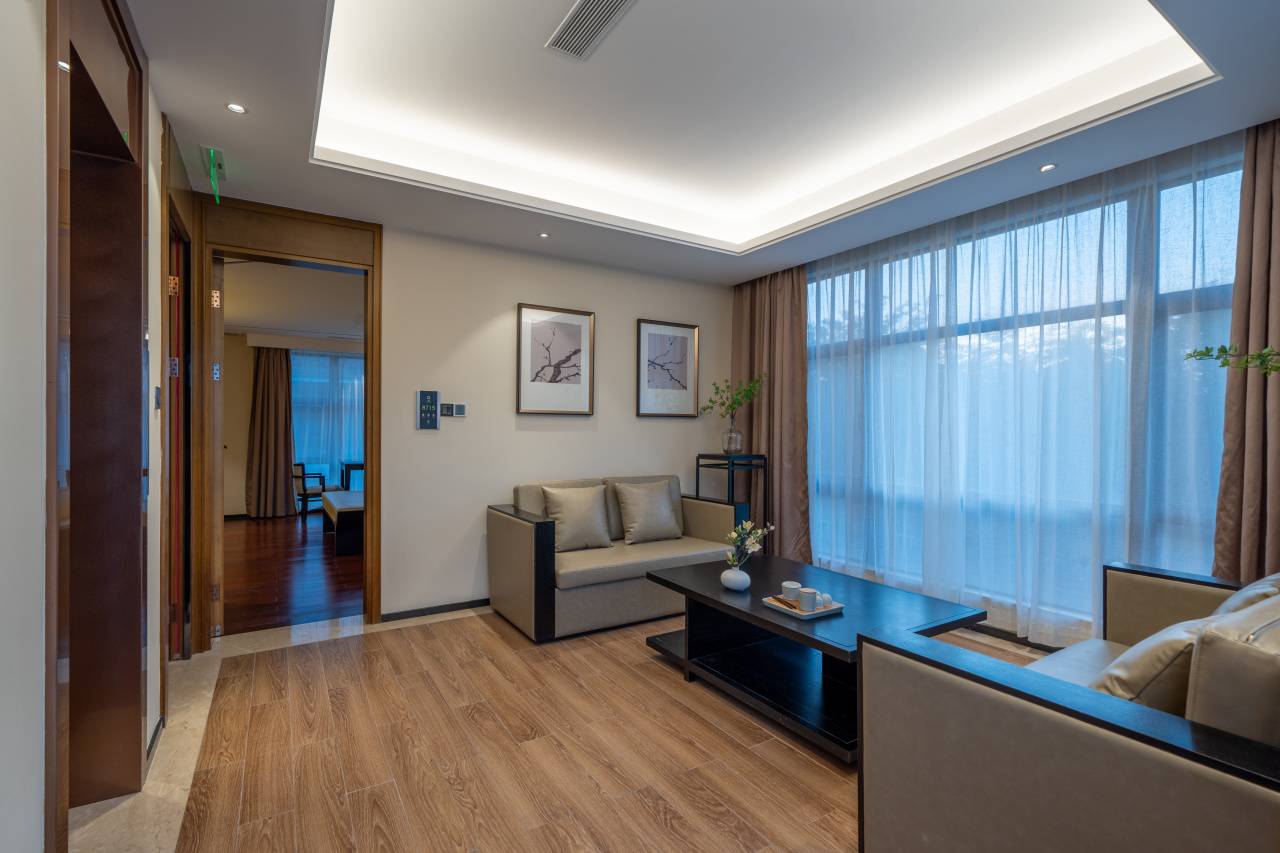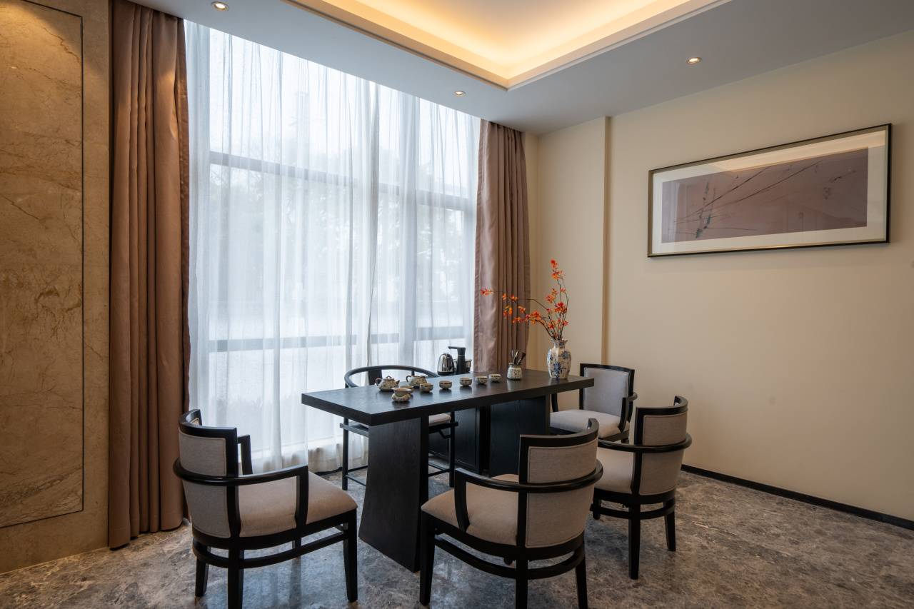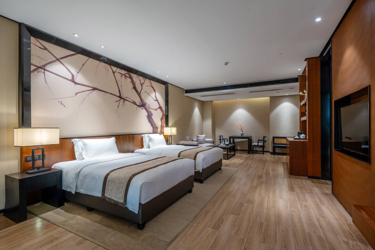 住在这里,推窗即是山林环抱,闭眼全是清风与泉鸣。酒店和自然美景融为一体,不止于宿,更是一场身心的归隐。这里还配备了健身房、自助洗衣房、棋牌室、智能会议室,一楼中西餐厅品尝丰富的自助早餐与时令珍馐,于茶艺中心静心品茗,找到属于自己的一方天地。