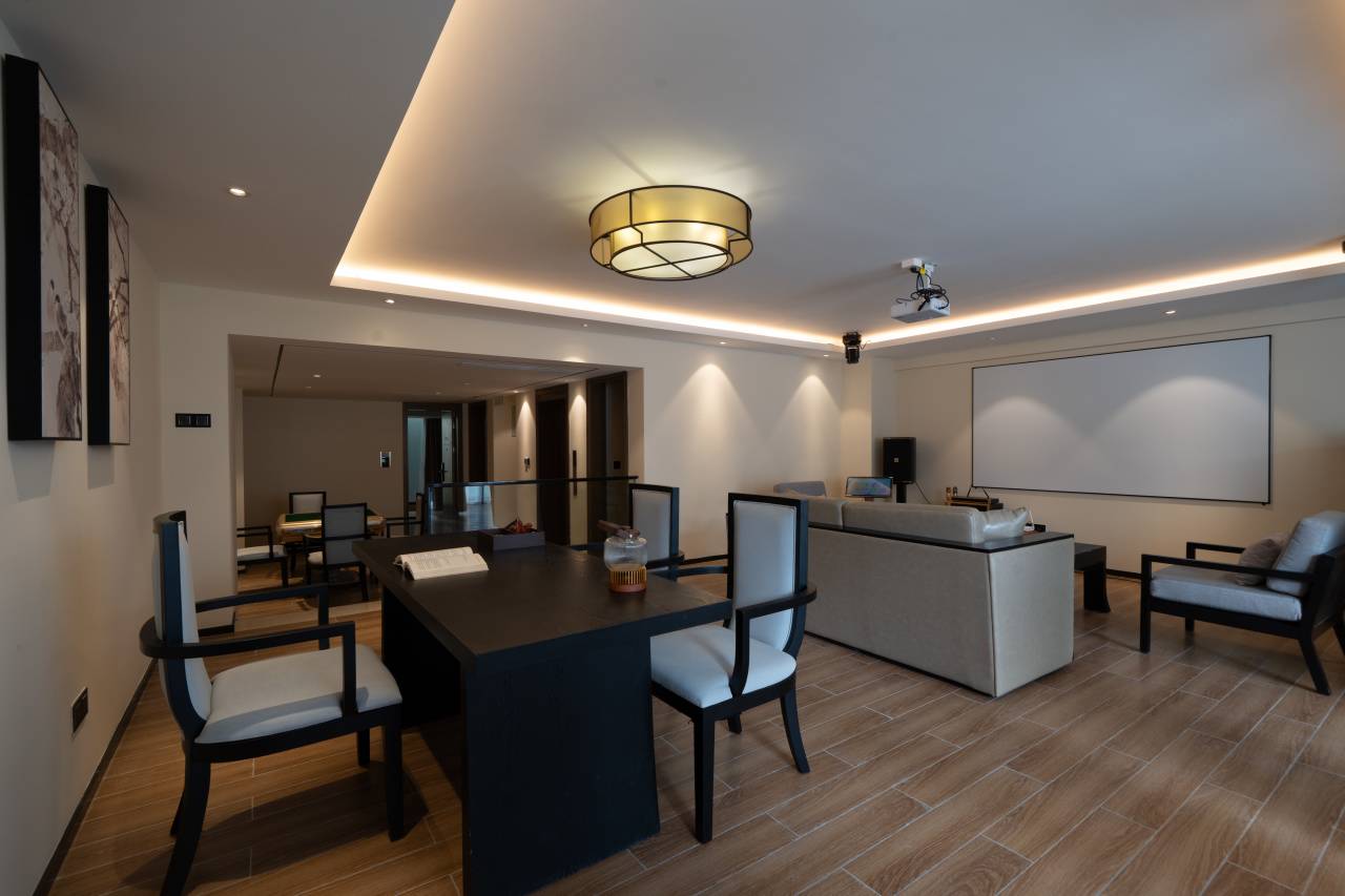 新中式风格的外观自带高级感,白墙+木饰面的搭配清新又雅致,宽敞的庭院和通透采光,一进就氛围感拉满,集庭院温泉私汤、欢唱KTV、棋牌娱乐及自助厨房于一体,房顶的露台还可以烧烤狂欢,专为家庭欢聚与挚友派对设计,尽享一站式私密度假时光。