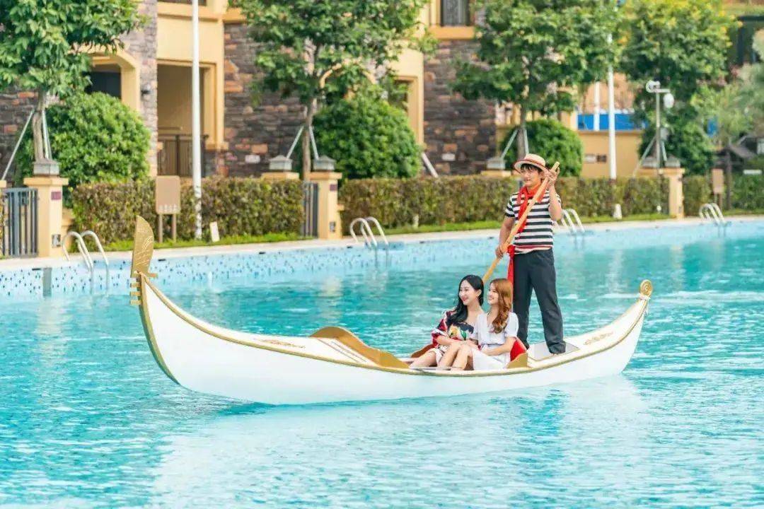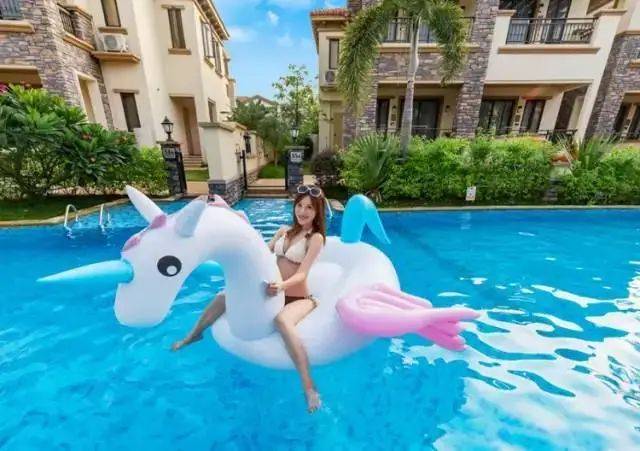 水中有各种火烈鸟、玻璃船等网红玩水道具