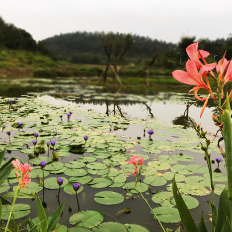 岸边花草树木相伴,度假区虫鸣鸟叫