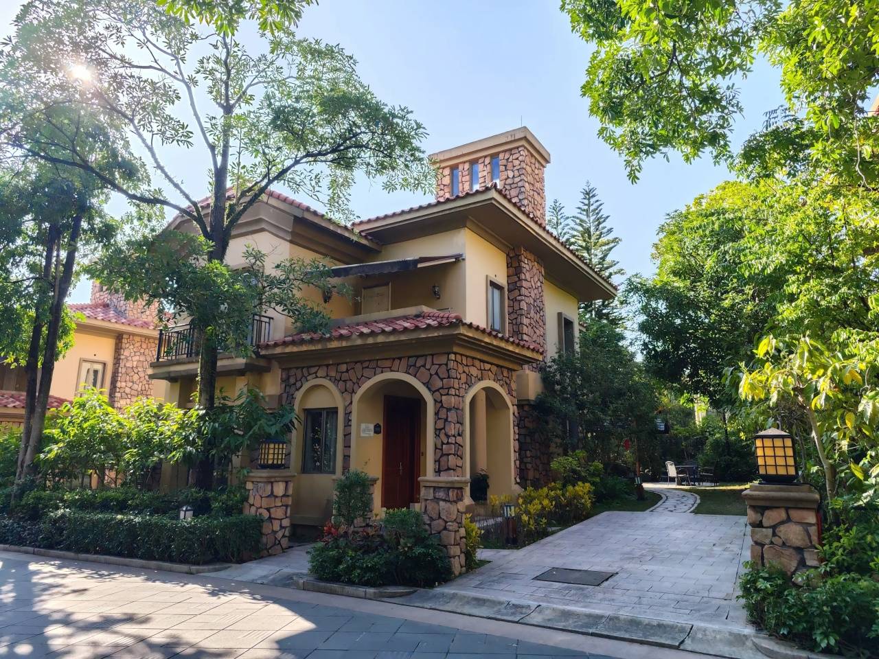 沿林荫小道走进去,看依山而建的山林别墅