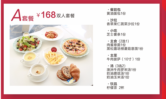 168元牛肉鼓萨双人餐包含:黄油面包1份+香草果仁蔬菜沙拉1份+肉酱意面/黑松露培根蘑菇意面(2选1)+牛肉鼓萨1份+罗宋汤/蘑菇汤/王米汤(3选2)+芝士著条1份+柠檬茶2杯
