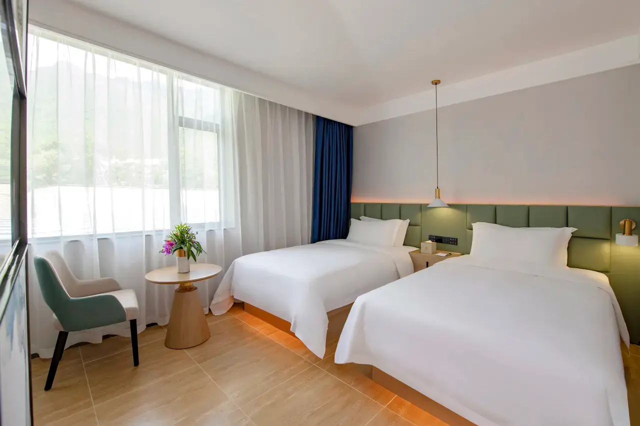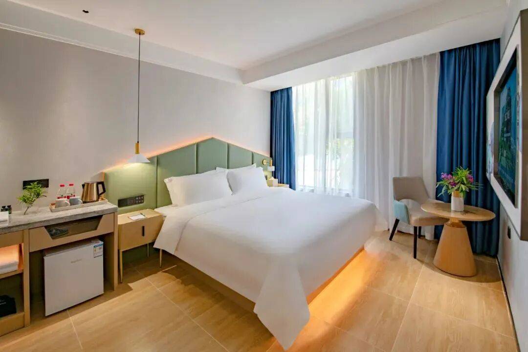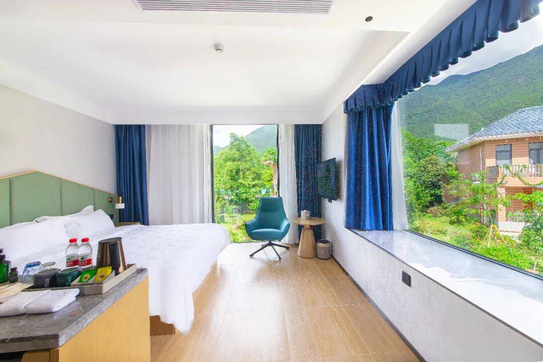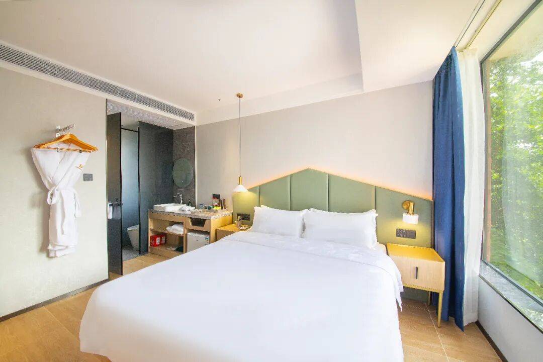 30平米的憩逸山景大床房,清新的室内设计,搭配柔和的灯光,窗外是绿意葱茏。