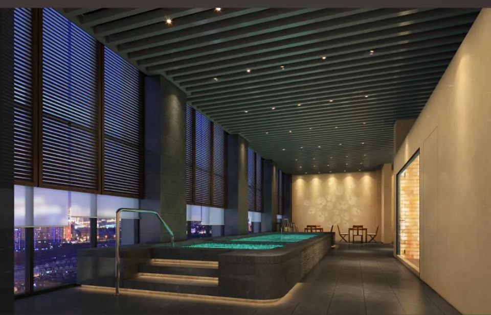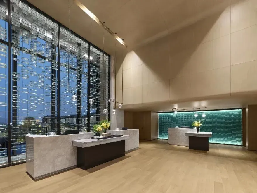 酒店由由香港郑中设计事务所(CCD)主笔室内设计。大堂悬挂的玻璃瀑布,水波纹背景墙、天花板,契合多元形态的“水元素”设计,以“水的灵动”打造轻奢美感。