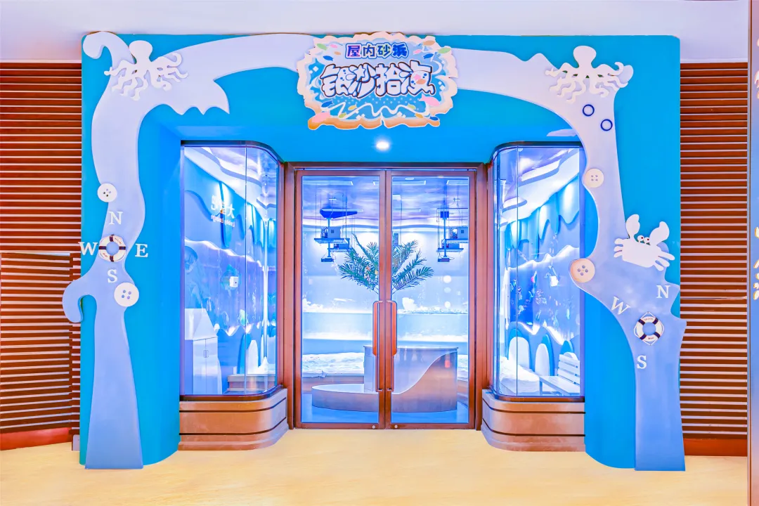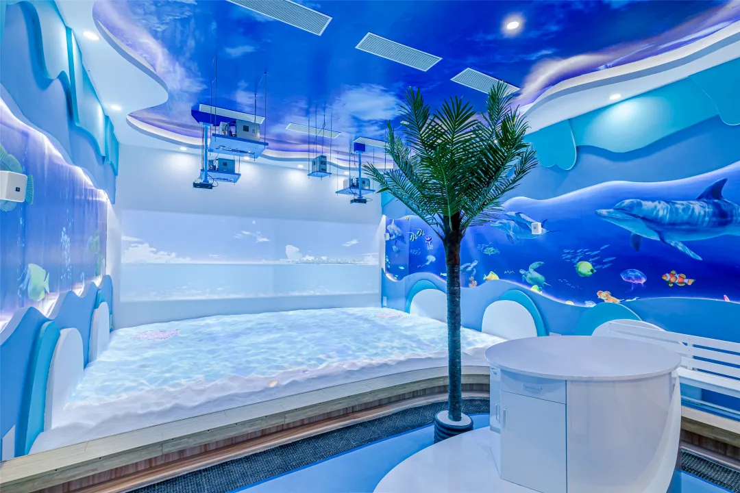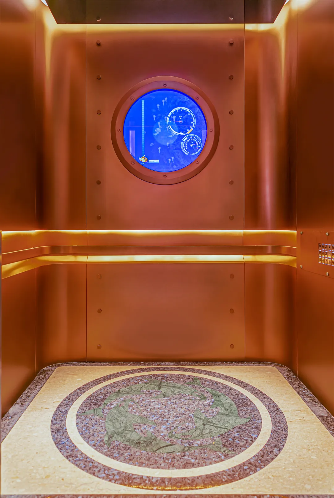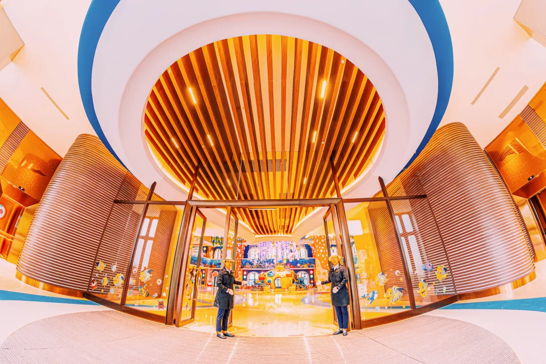 6只金色海豚烘托起五彩贝壳镶嵌的穹顶,海马、海星、水母、珊瑚等海洋元素汇集在大堂中央巨型玻璃艺术装置上,彷如置身海底仙宫~