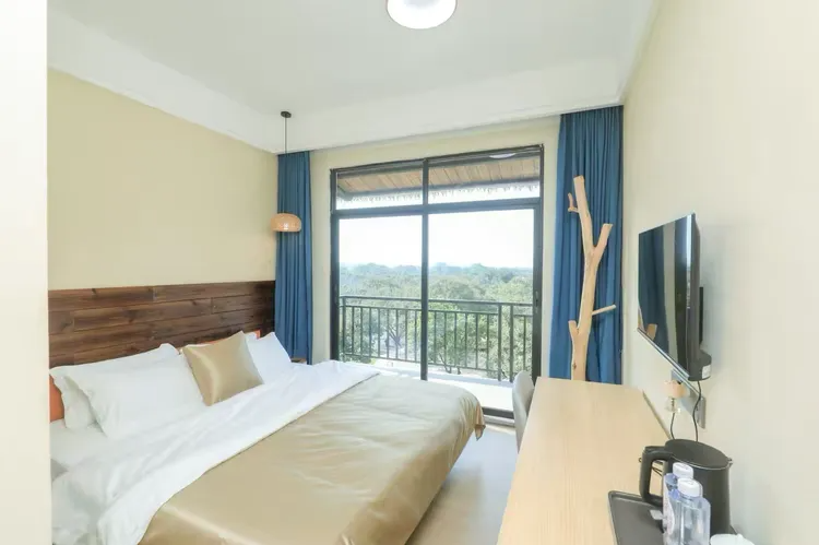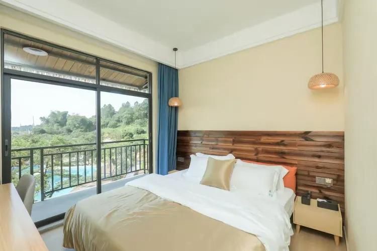 客房简洁墙面与原木交织,落地窗引自然入室